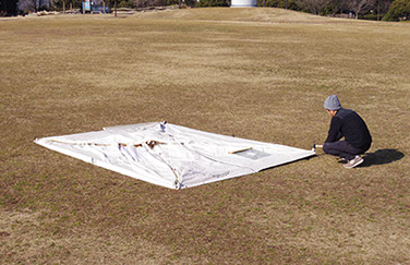 *先端にループロープがついており、木などに掛ければ、センターポールの必要性が無く広く使うことが可能です。