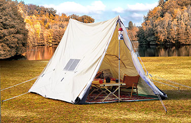 one side to be raised as an awning and admit the warmth of a camp fire.